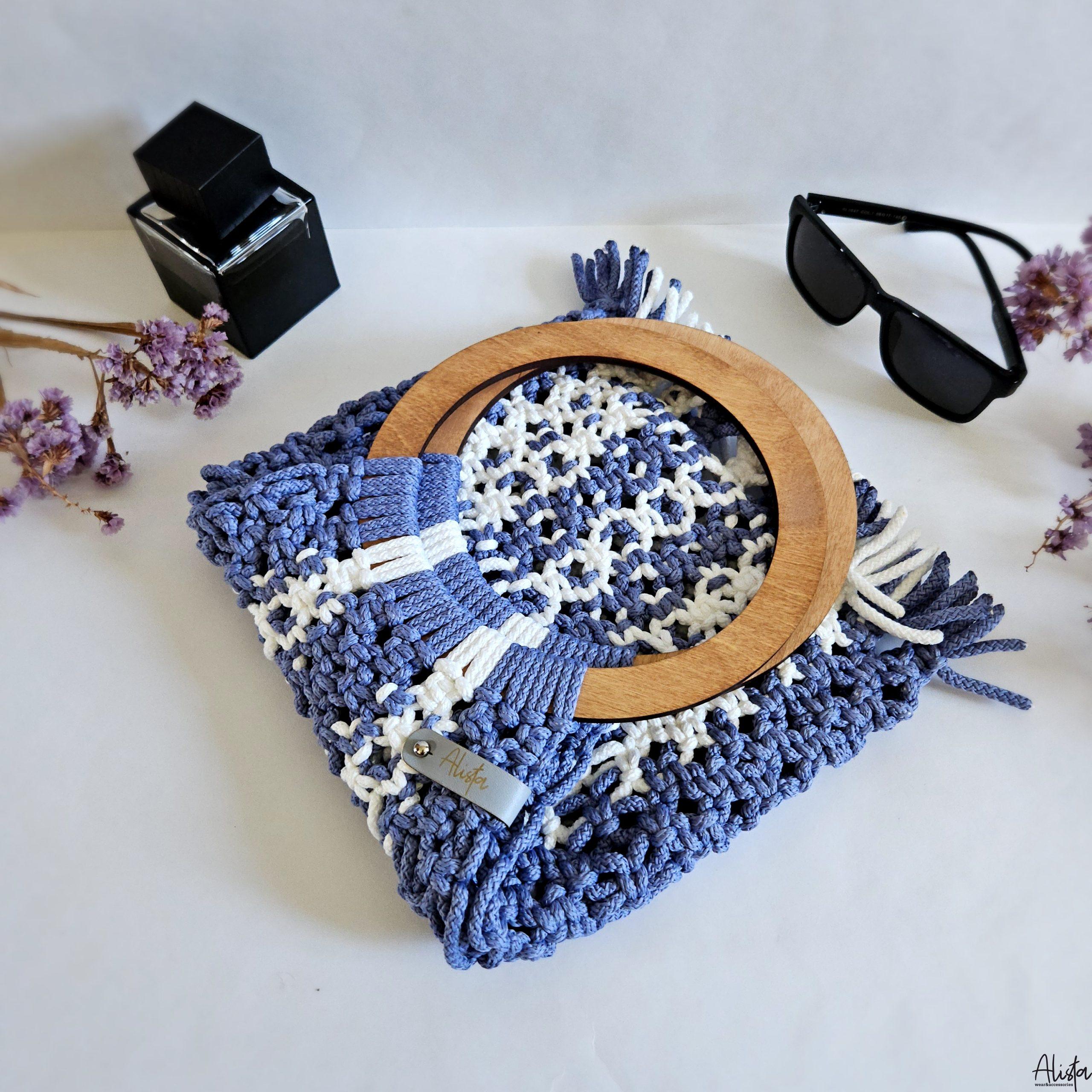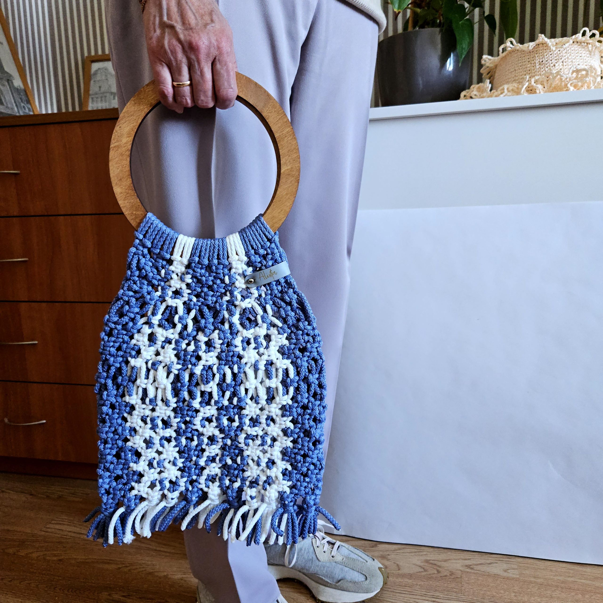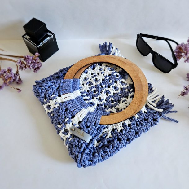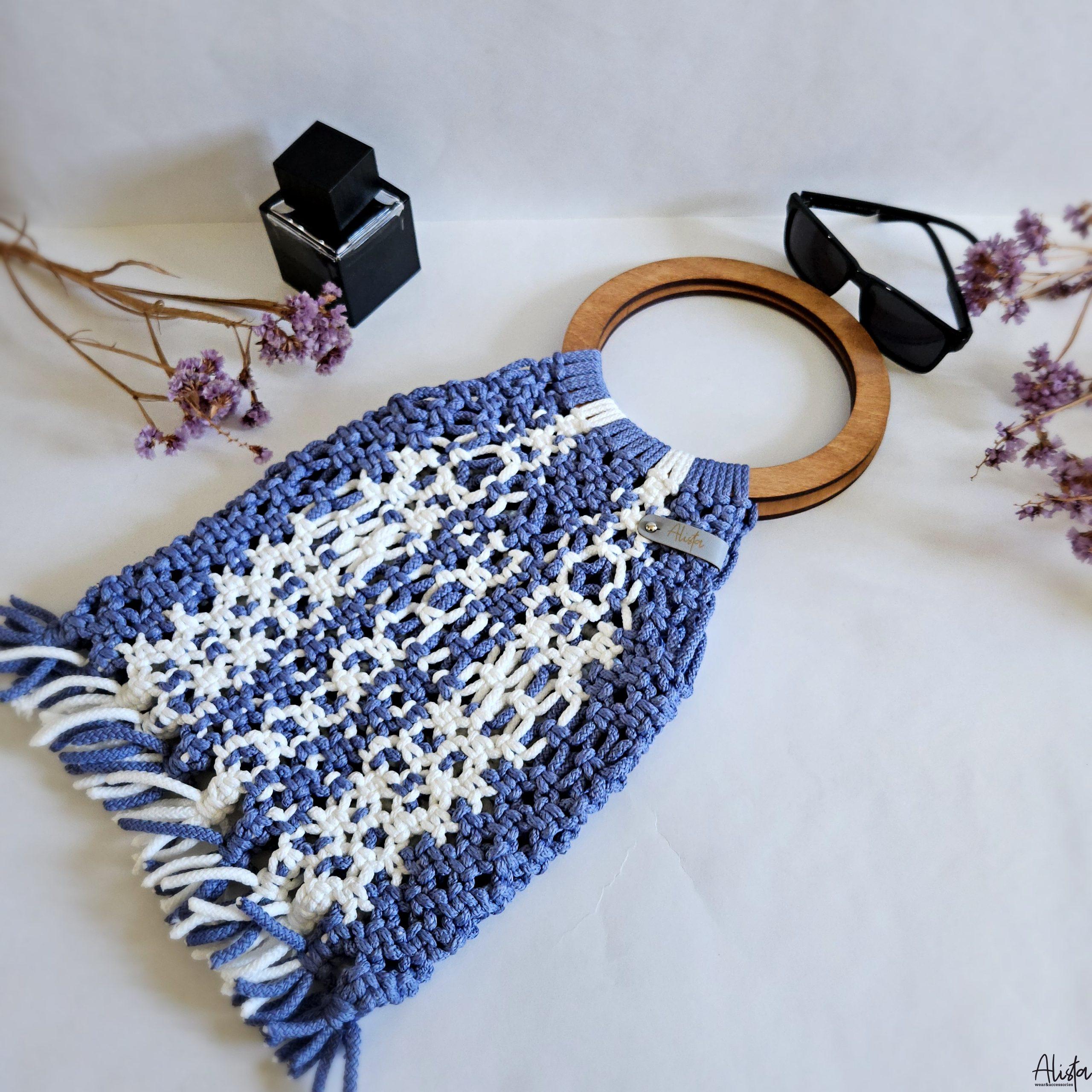 Авоська ручной работы в технике макраме из полиэфирного шнура с большими круглыми деревянными ручками, благодаря которым авоську можно носить не только в руке, но и на локтевом сгибе, что очень удобно.