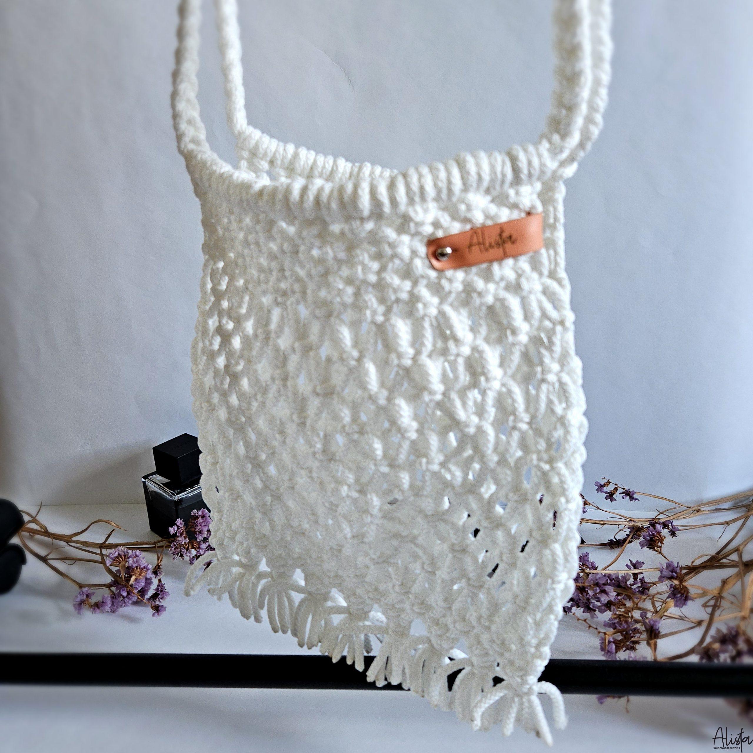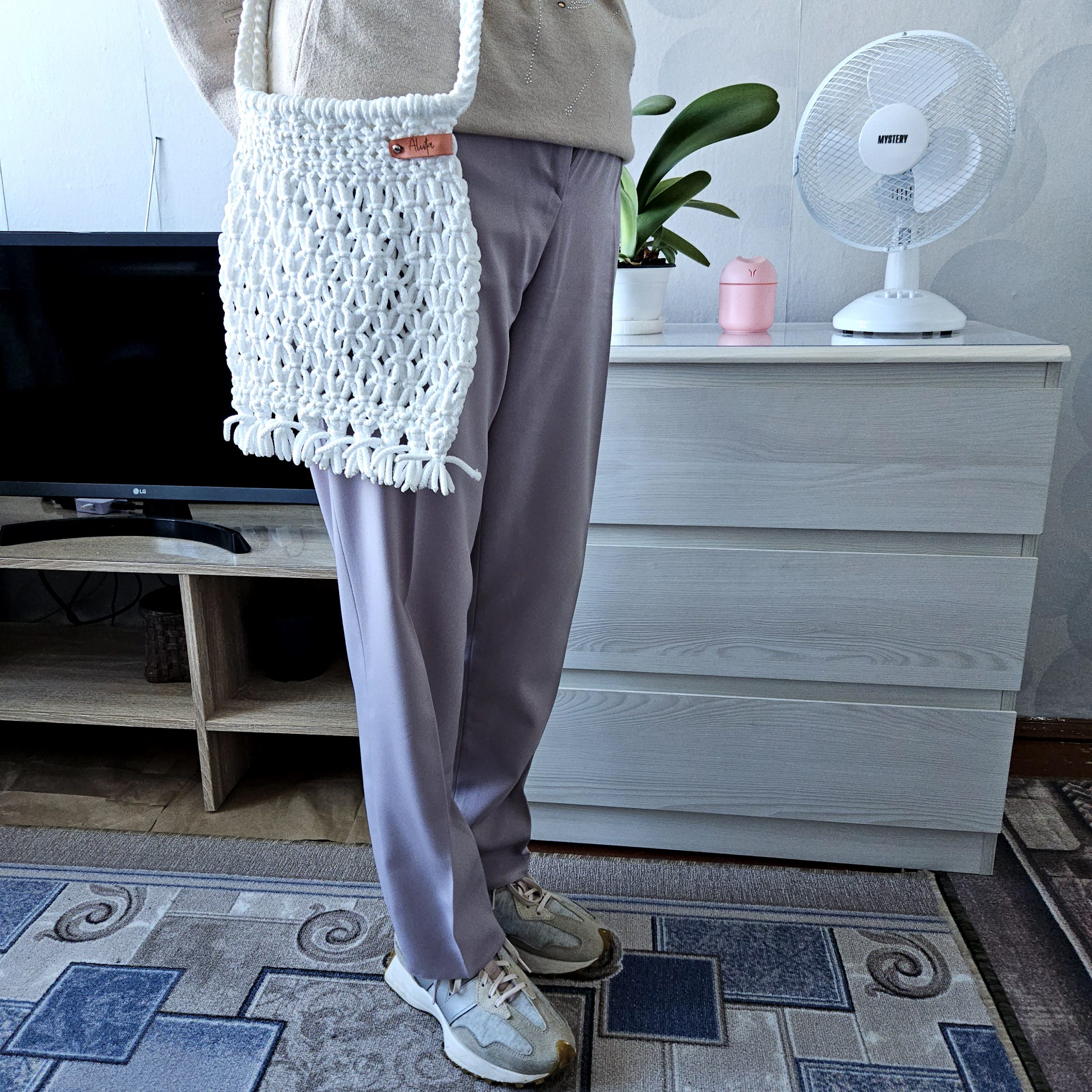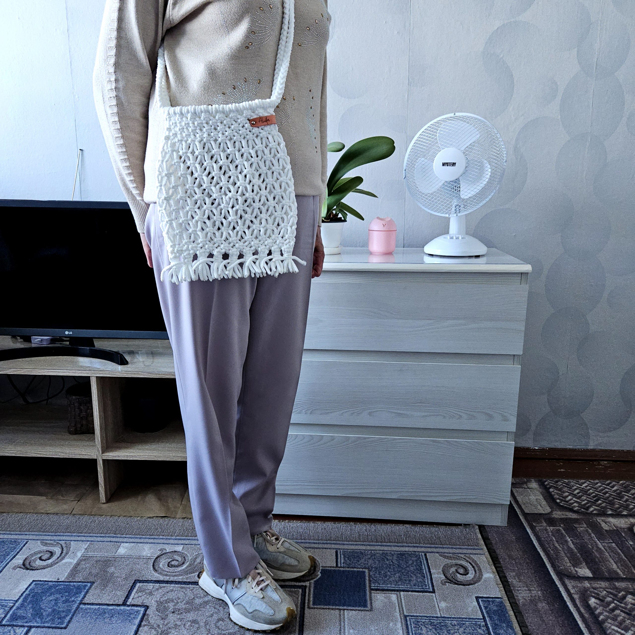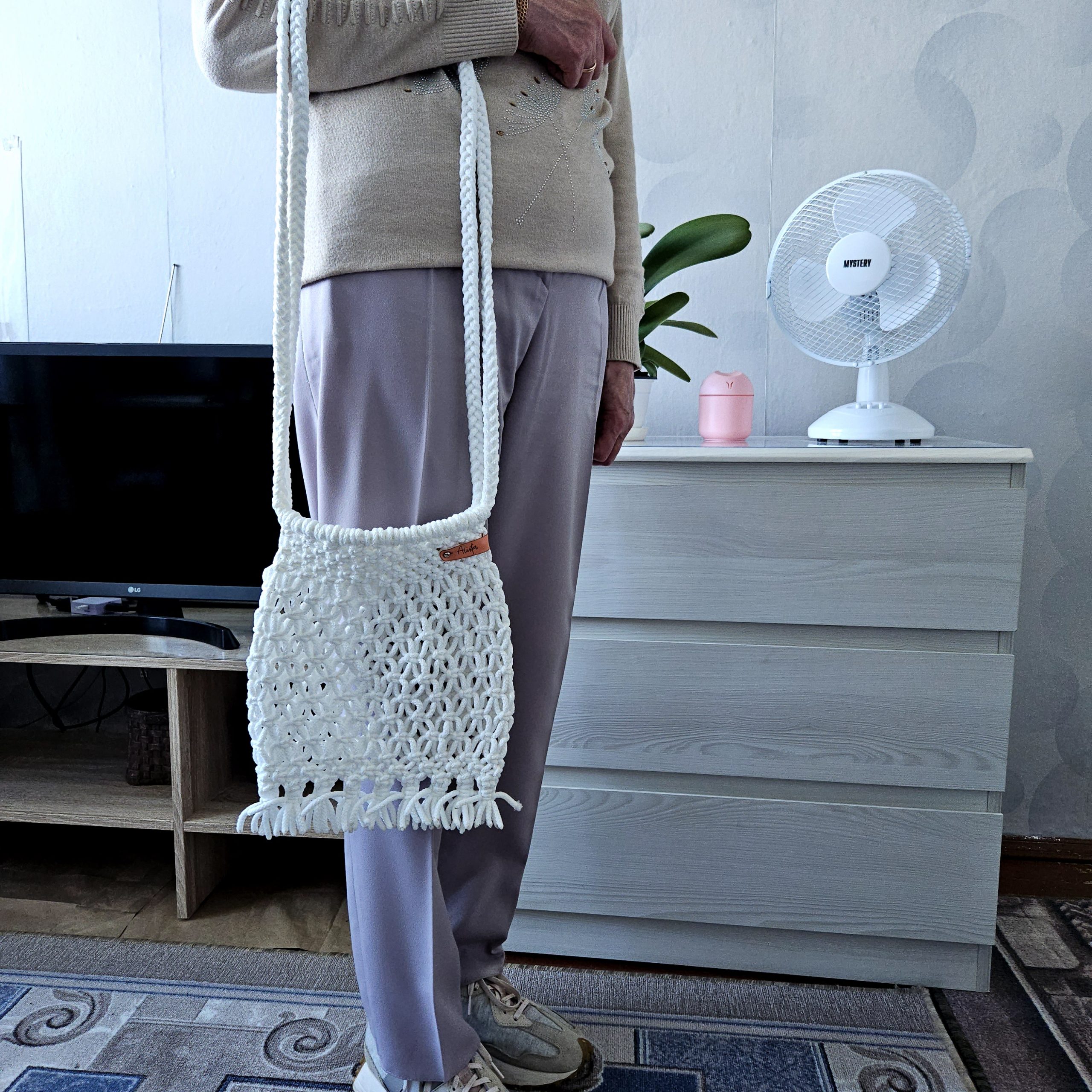 Сумка Кросс-боди ручной работы в технике макраме из полиэфирного шнура с длинными плетёными ручками.
