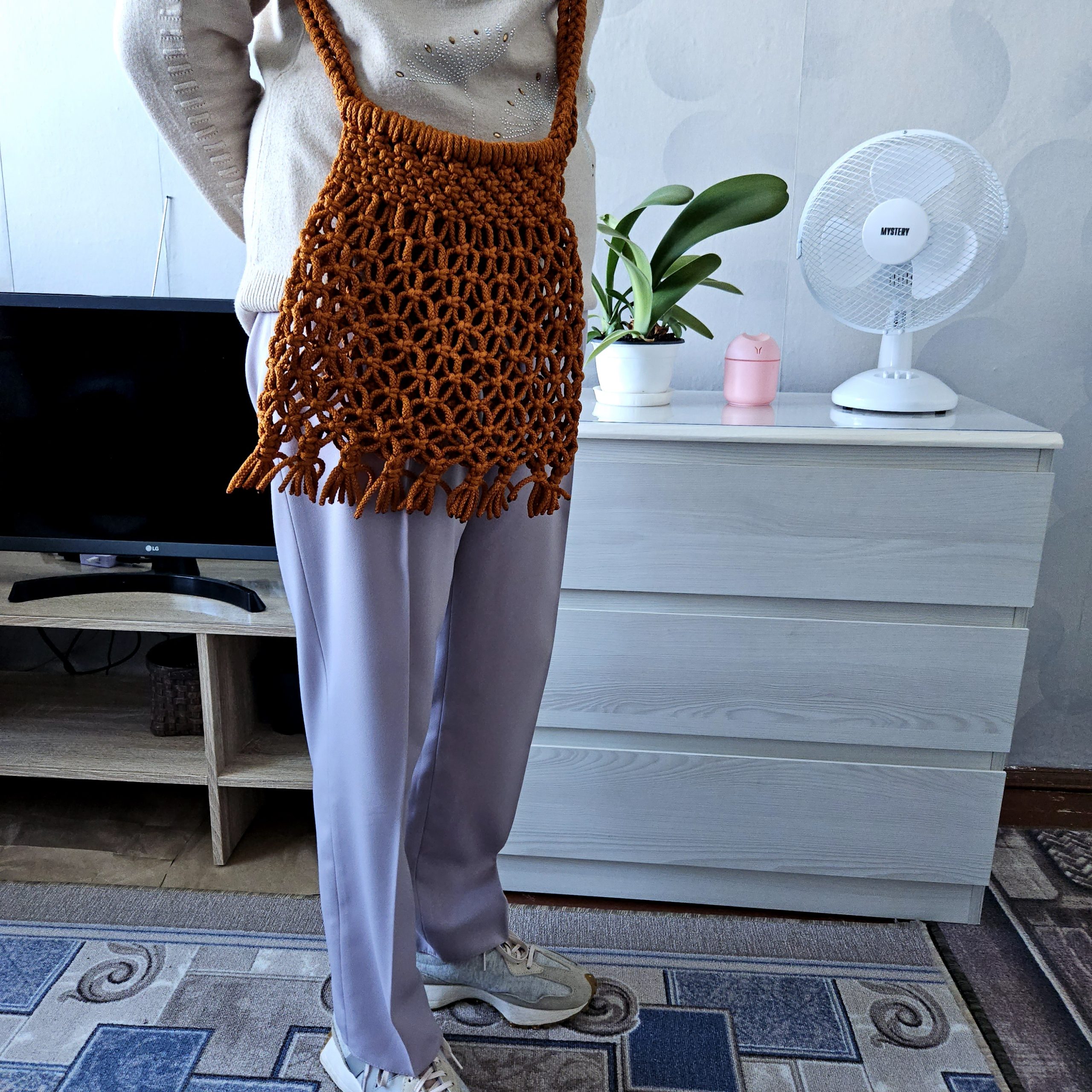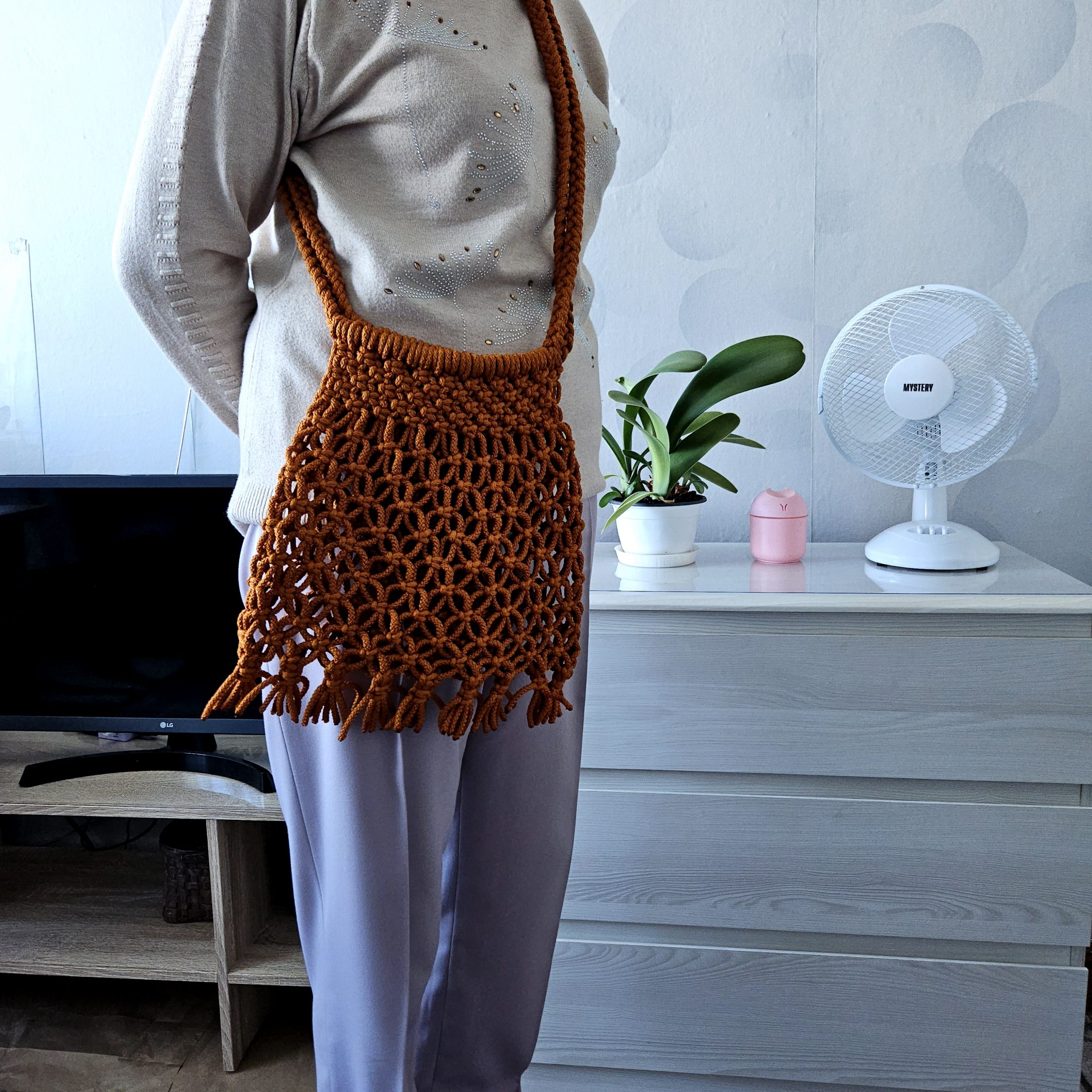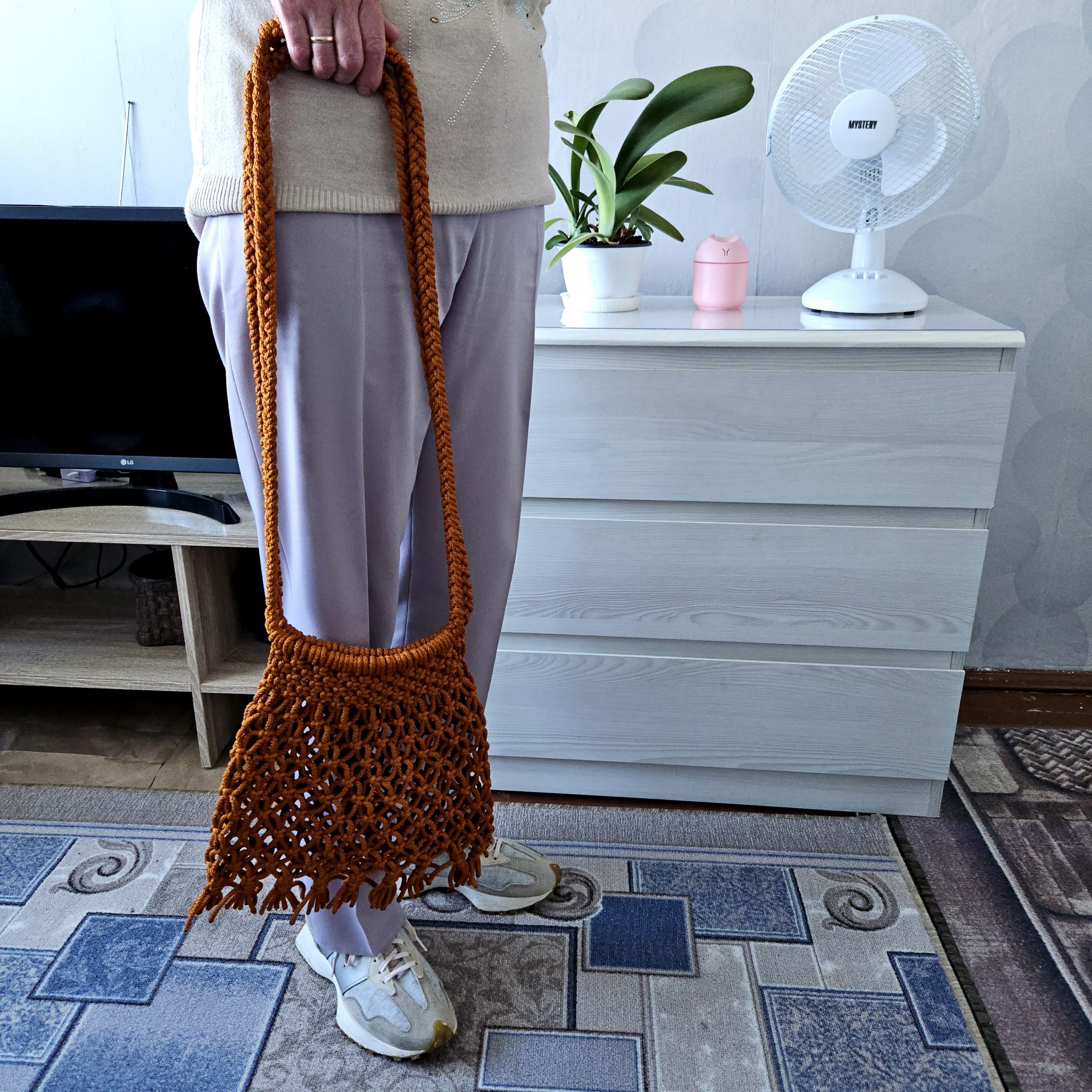 Сумка Кросс-боди ручной работы в технике макраме из полиэфирного шнура с длинными плетёными ручками.