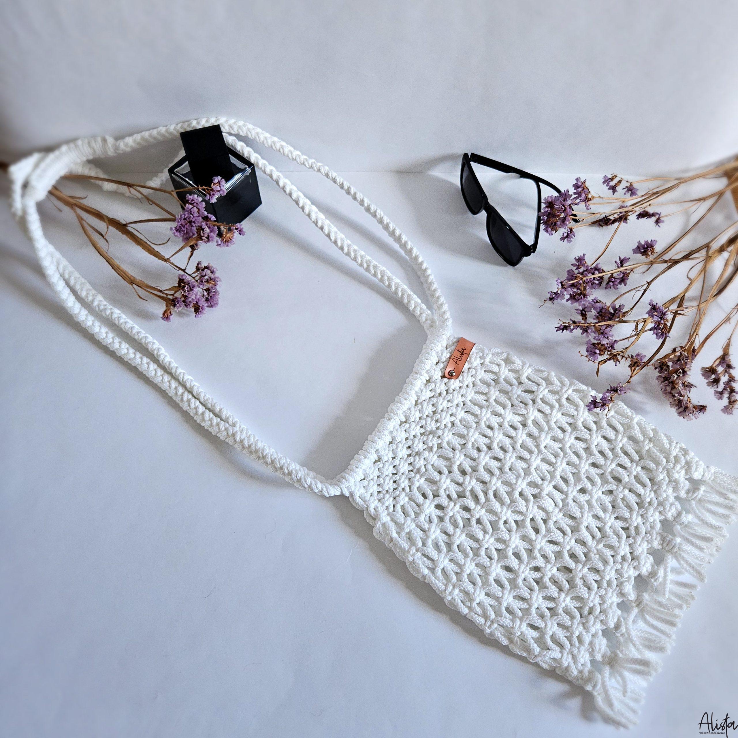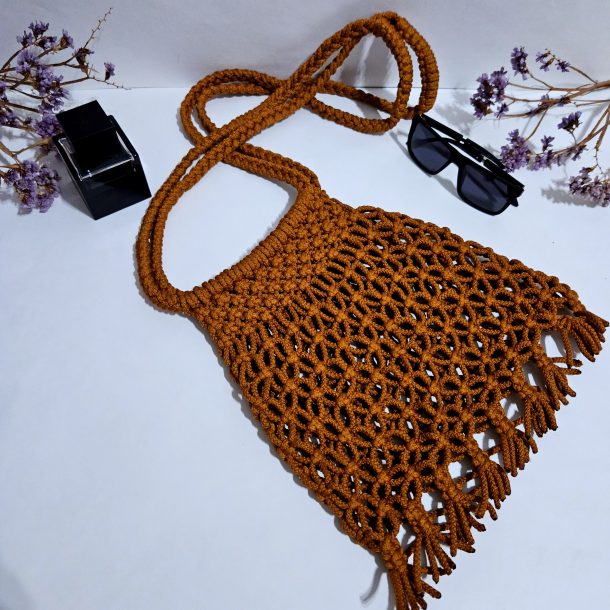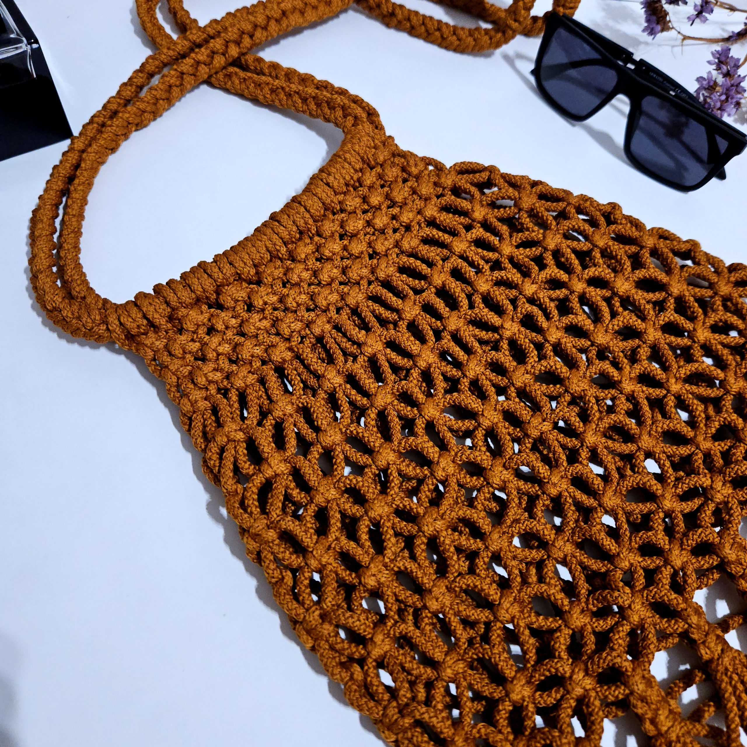 Сумка Кросс-боди ручной работы в технике макраме из полиэфирного шнура с длинными плетёными ручками.