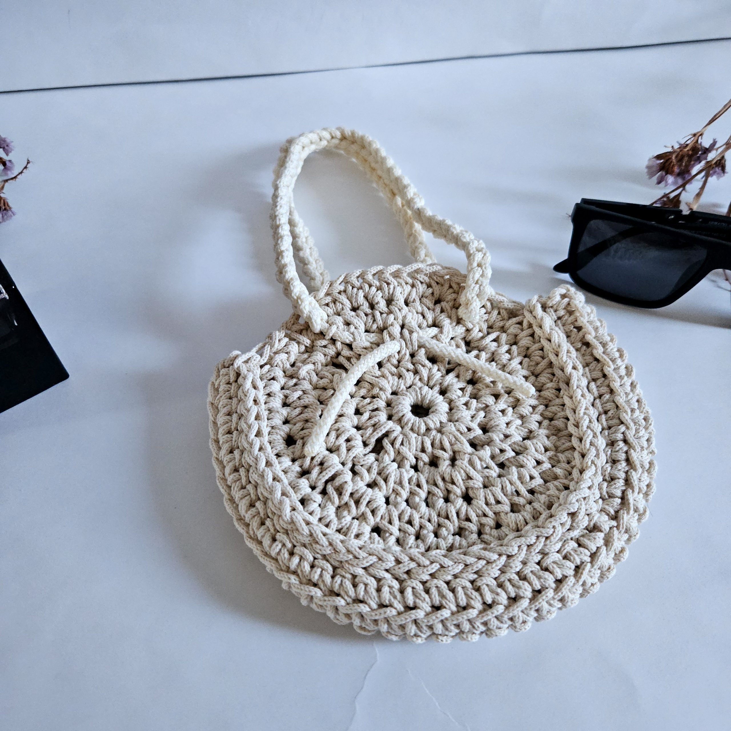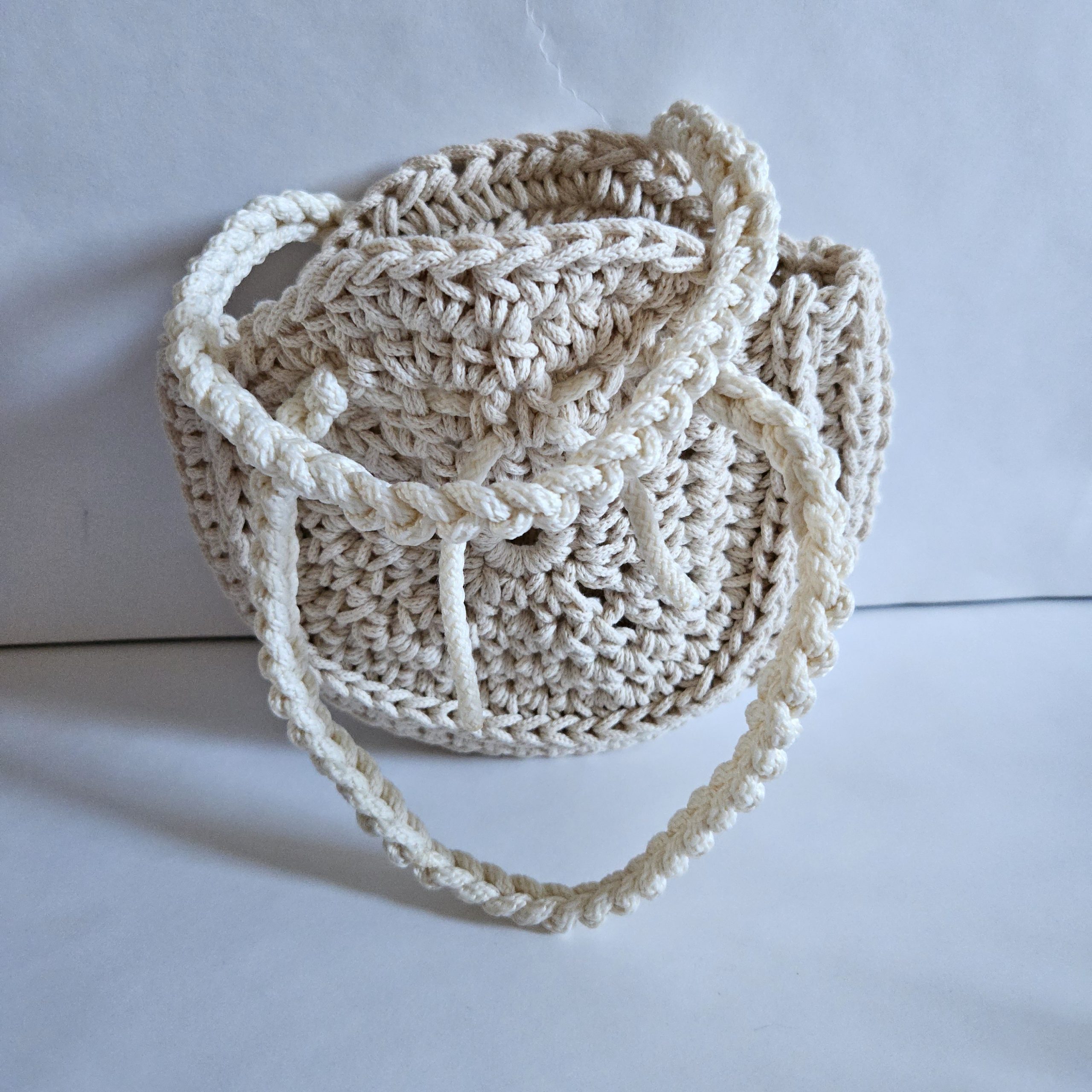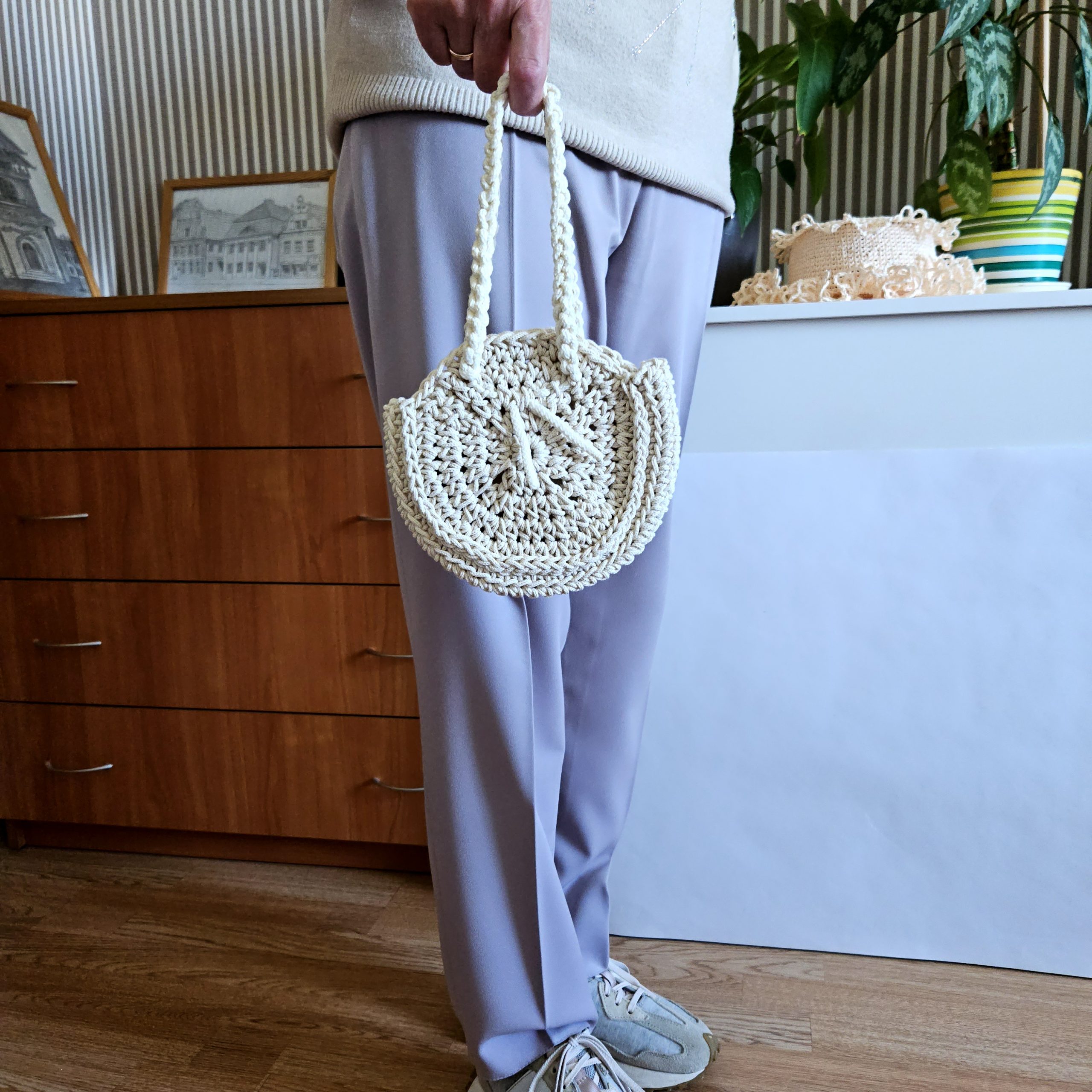 Мини-сумочка ручной работы в технике макраме из хлопкового шнура с плетёными ручками из полиэфирного шнура.