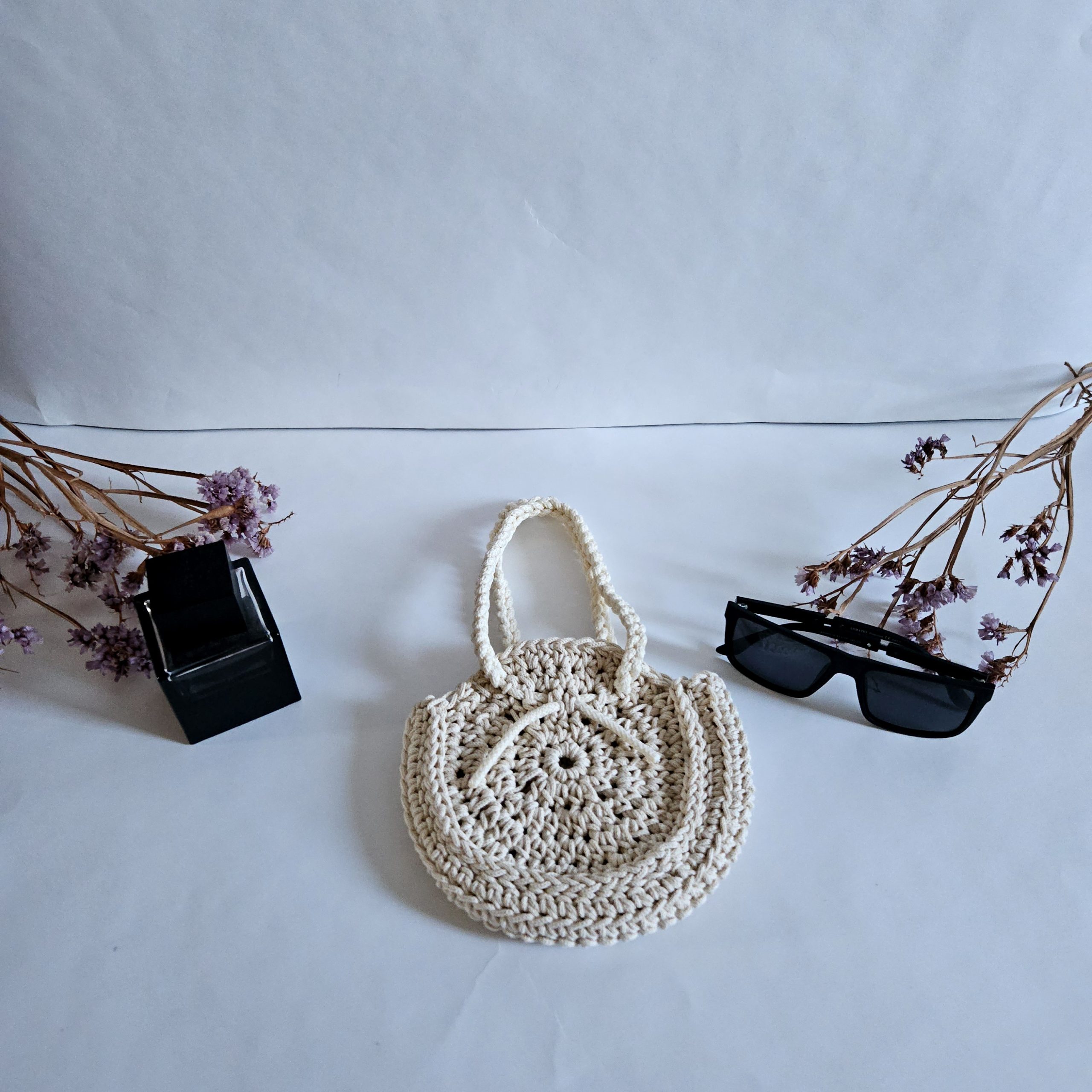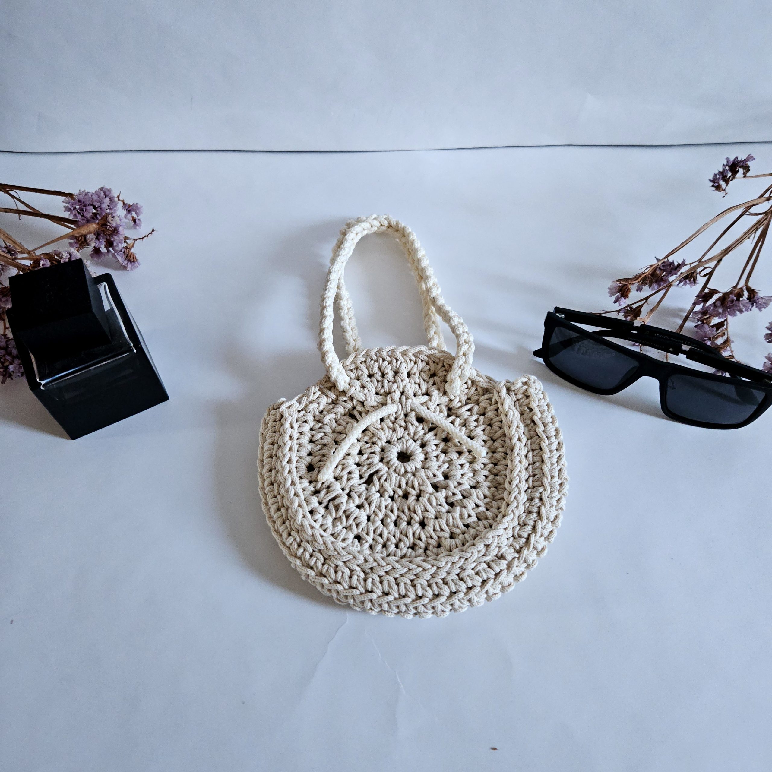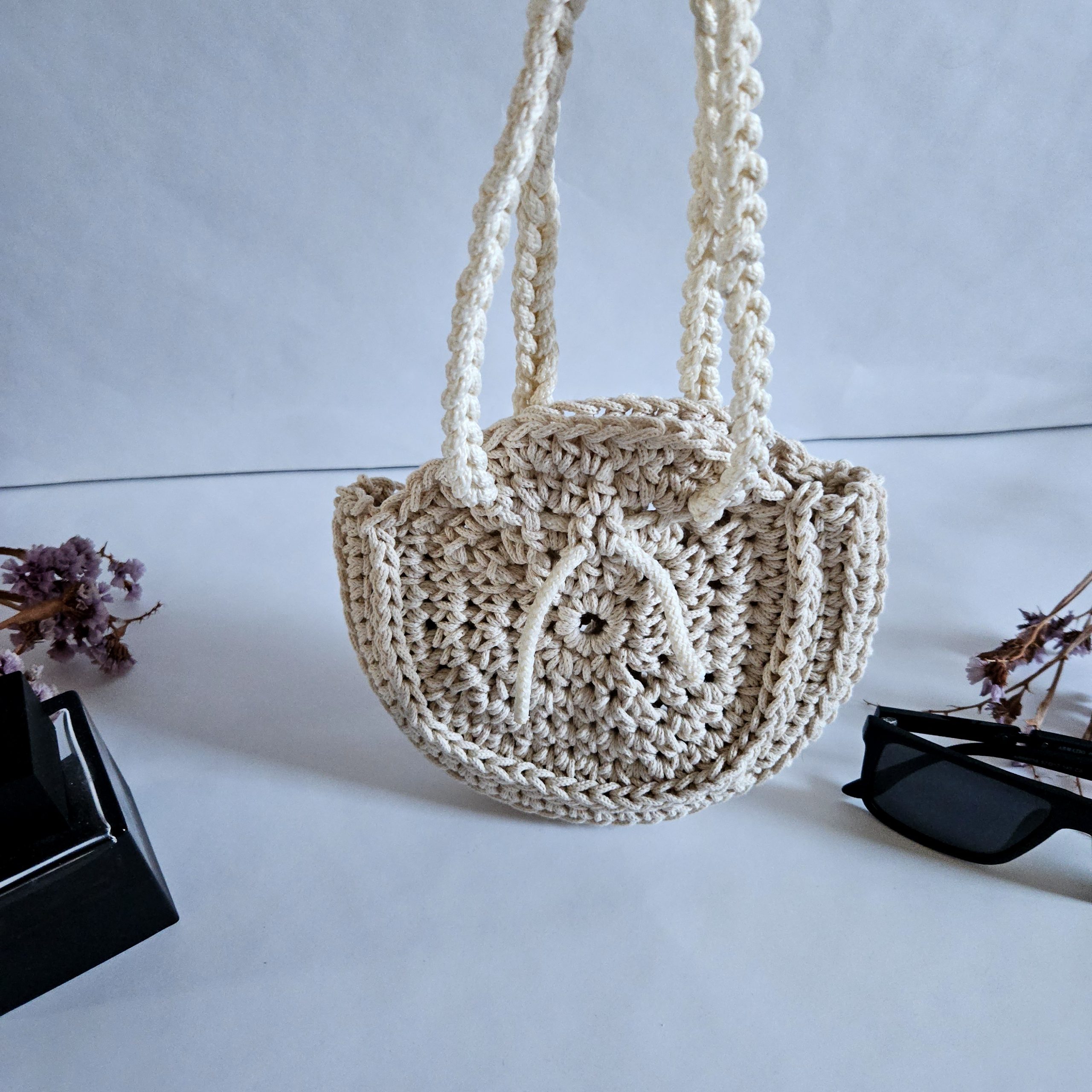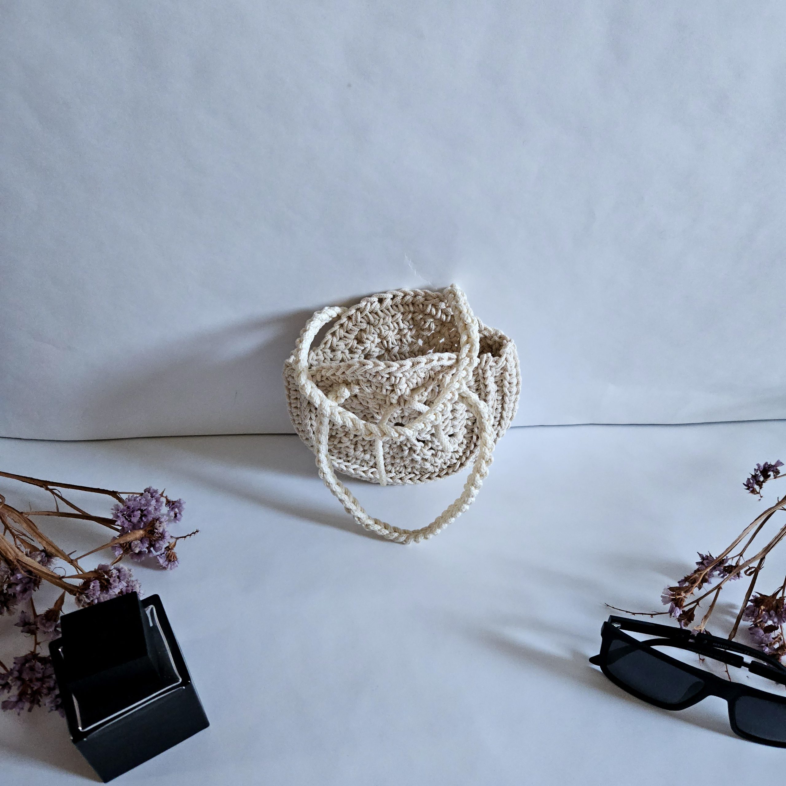 Мини-сумочка ручной работы в технике макраме из хлопкового шнура с плетёными ручками из полиэфирного шнура.