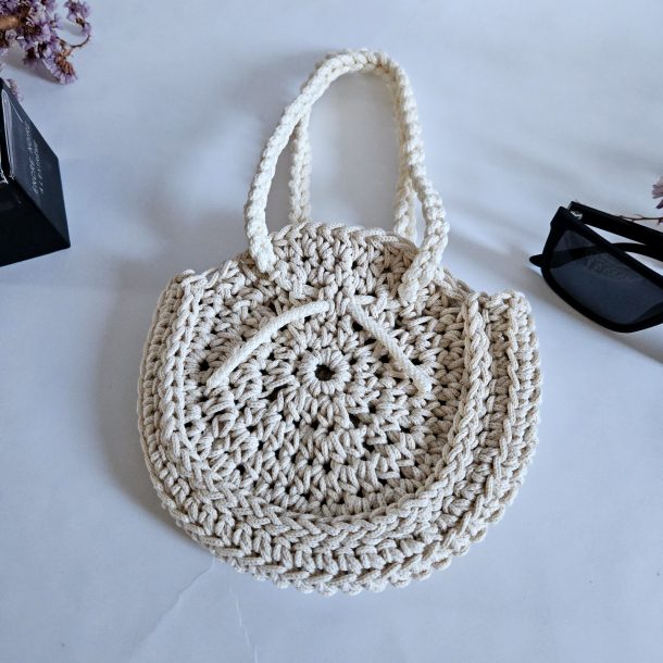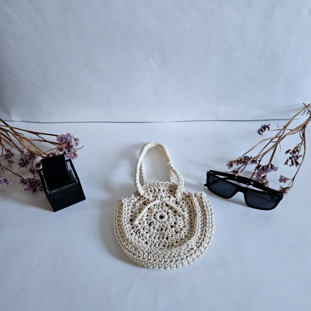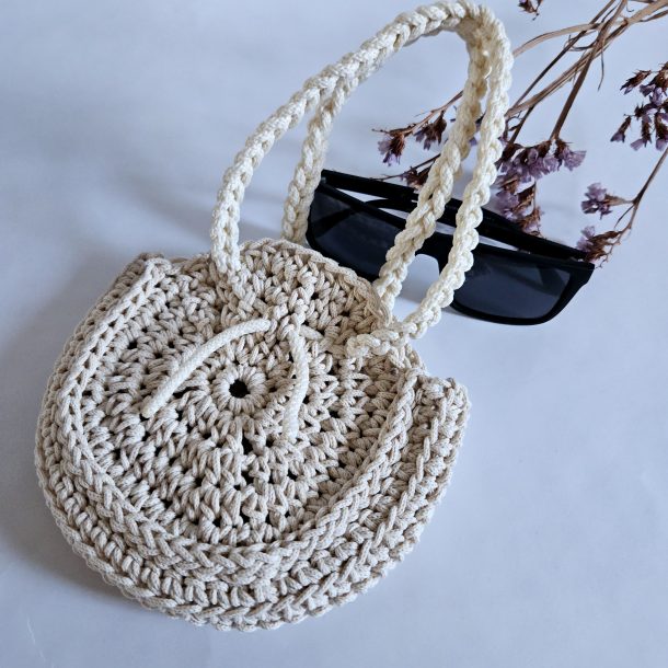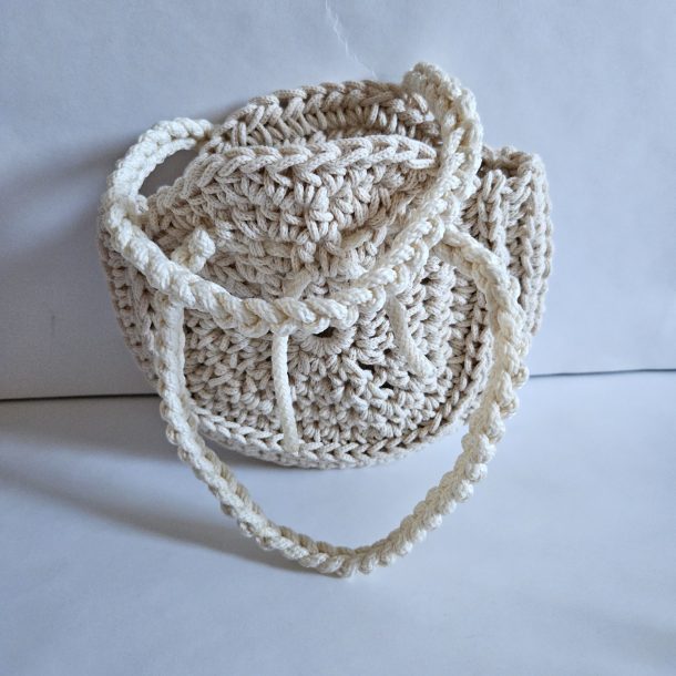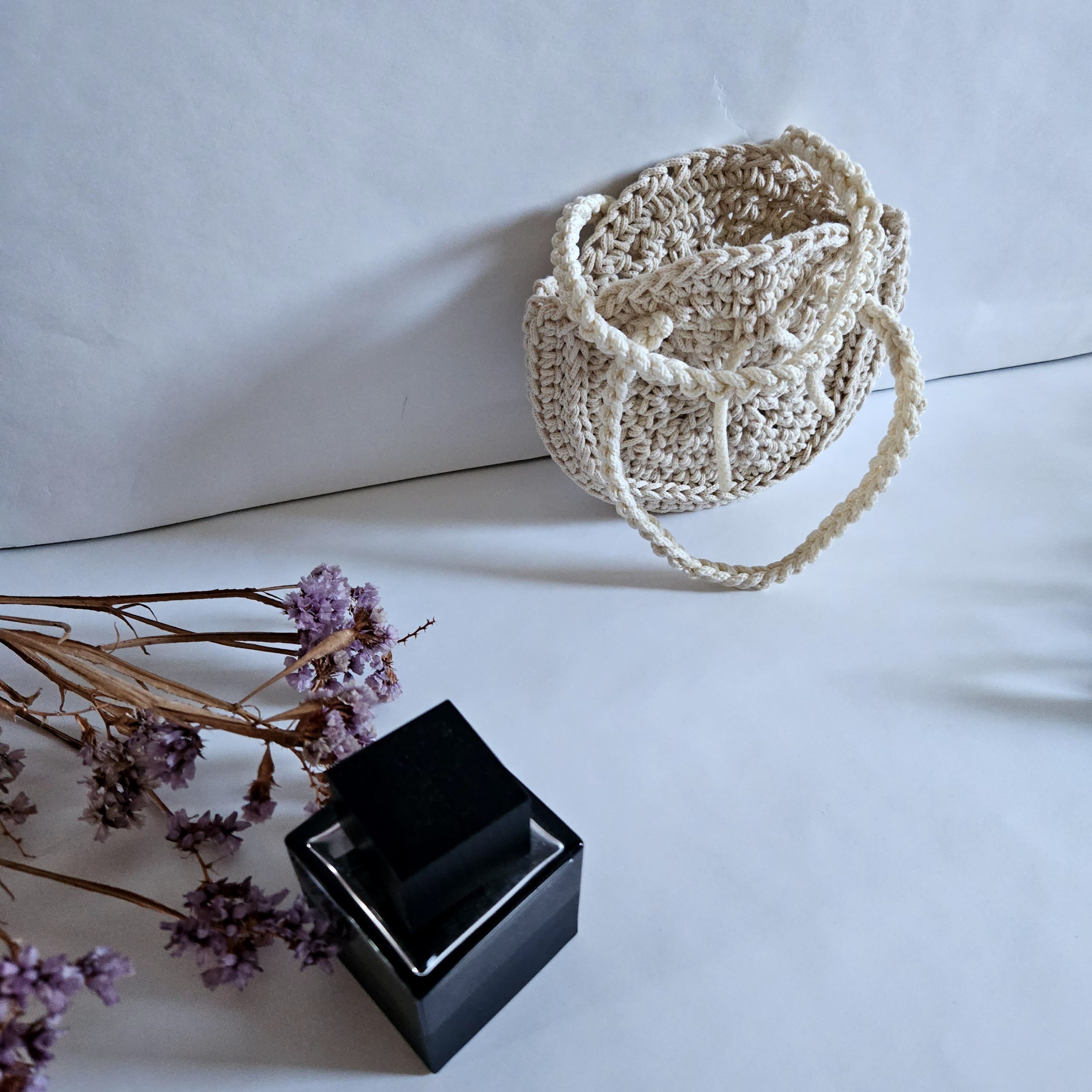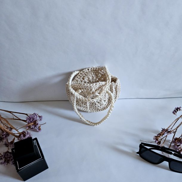Сумочка сплетена из хлопкового шнура небольшого диаметра (2 мм). Хлопковый шнур очень прочный и неприхотлив в использовании – он не боится пыли и грязи, а загрязнения легко убираются при помощи влажной губки. Ручки сумочки сплетены из полиэфирного шнура диаметром 5 мм.